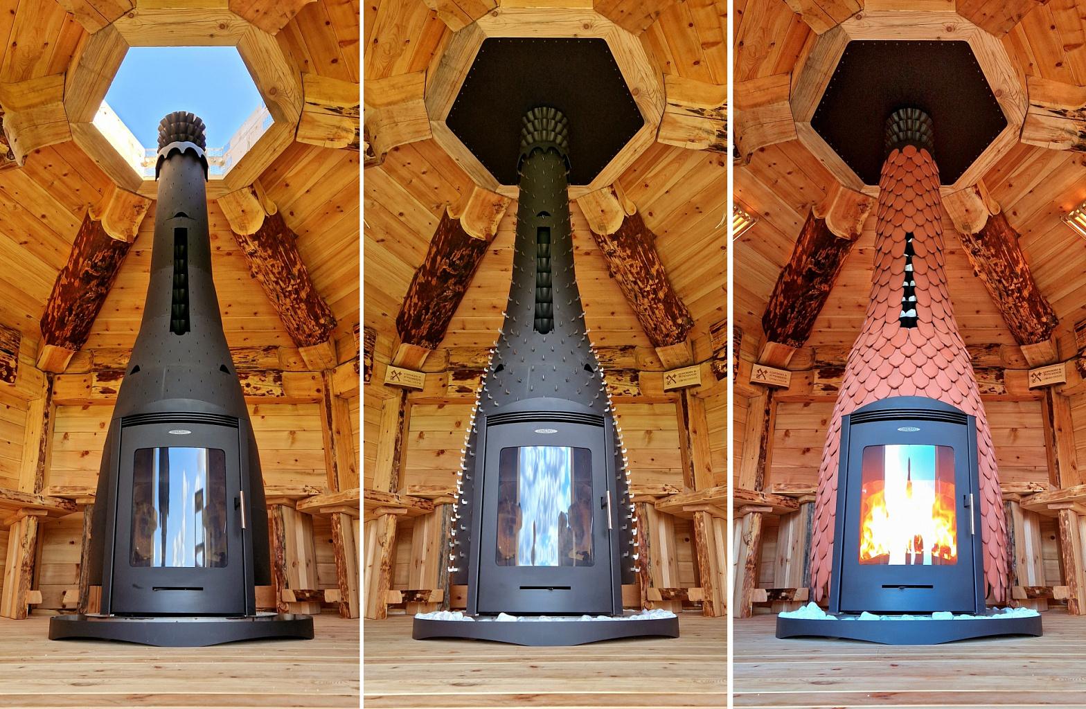 Первое, что бросается в глаза — эта печь огромна, потому что предназначена для очень больших парных. Также она крайне необычна по форме, поскольку объёмы топки и дымохода в ней соединены воедино, а все её поверхности — бионические.